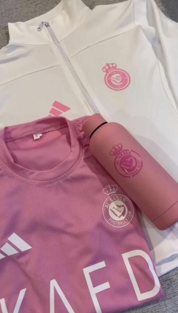 بكج الفخامة 🩷المنتج طقمًا رياضيًا لناديك المفضل، والذي يتضمن جاكيت رياضية بيضاء وتيشرت ورديًا.الطقم تصميم سعودي " ملابس الرياضية. السترة الرياضية البيضاء تحمل شعار ناديك وشعار آخرالقميص الوردي يحمل شعار النادي وشعار آخر